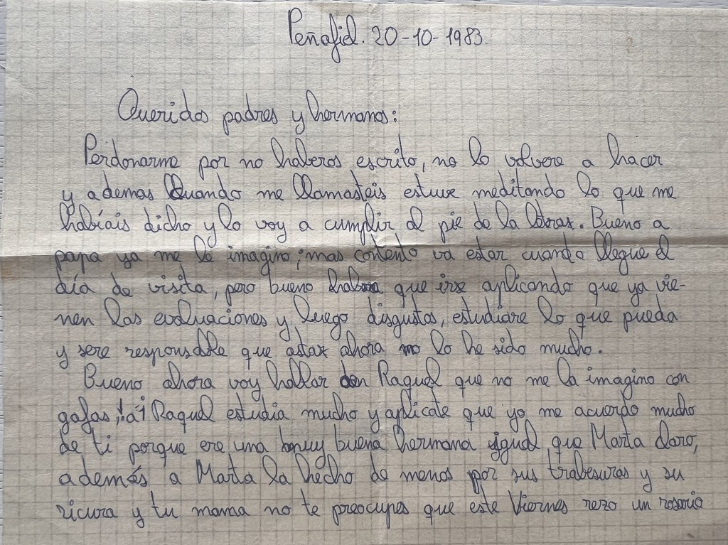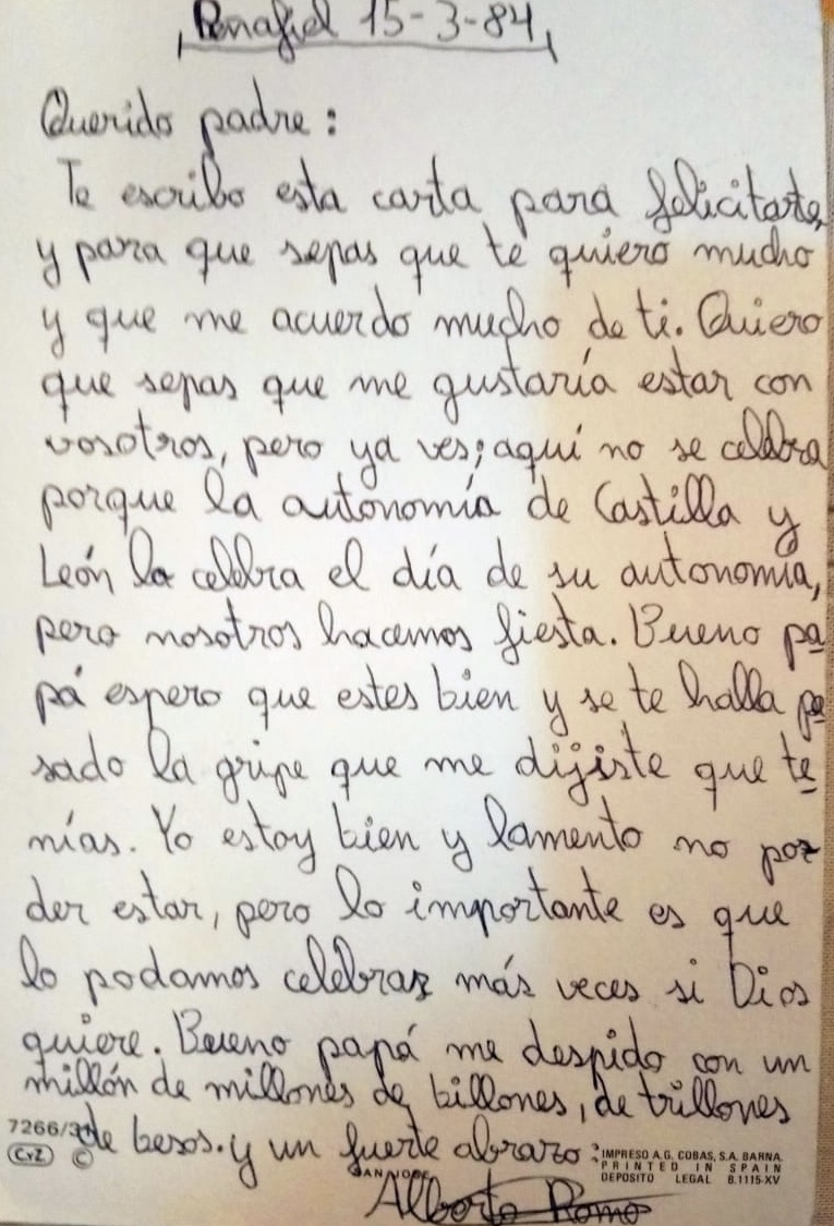 Este mes de marzo, conmemoramos la festividad de San José, esposo de María, Patrono de la Iglesia y padre. Recogemos en esta entrada un mensaje de felicitación que Alberto envió a su padre Marcelino por la festividad de San José. Con tan solo 12 años, tuvo la iniciativa de escribirle para hacerse presente en ese día del padre. Podemos observar el cariño que tenía por su padre y su tristeza por no poder celebrar juntos ese día tan importante, pues Alberto por aquel entonces, estaba en Peñafiel (Valladolid), en un colegio de los Hermanos Pasionistas.