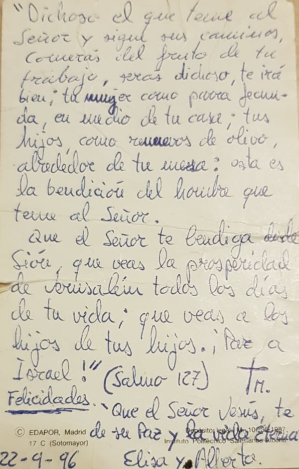 En este mes queremos destacar un mensaje que Alberto mandó a su cuñado Juanma, por el día de su cumpleaños el 22 de septiembre de 1996. A través de una tarjeta de felicitación, le trasladó un mensaje de apoyo y confianza en el Señor. Es el Salmo 127, nos viene bien recordar estas palabras cada día, para poner nuestra vida en Sus manos y confiar plenamente en Él.