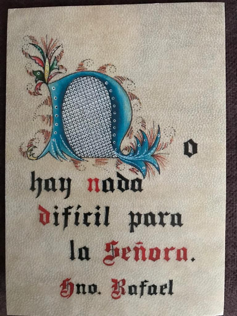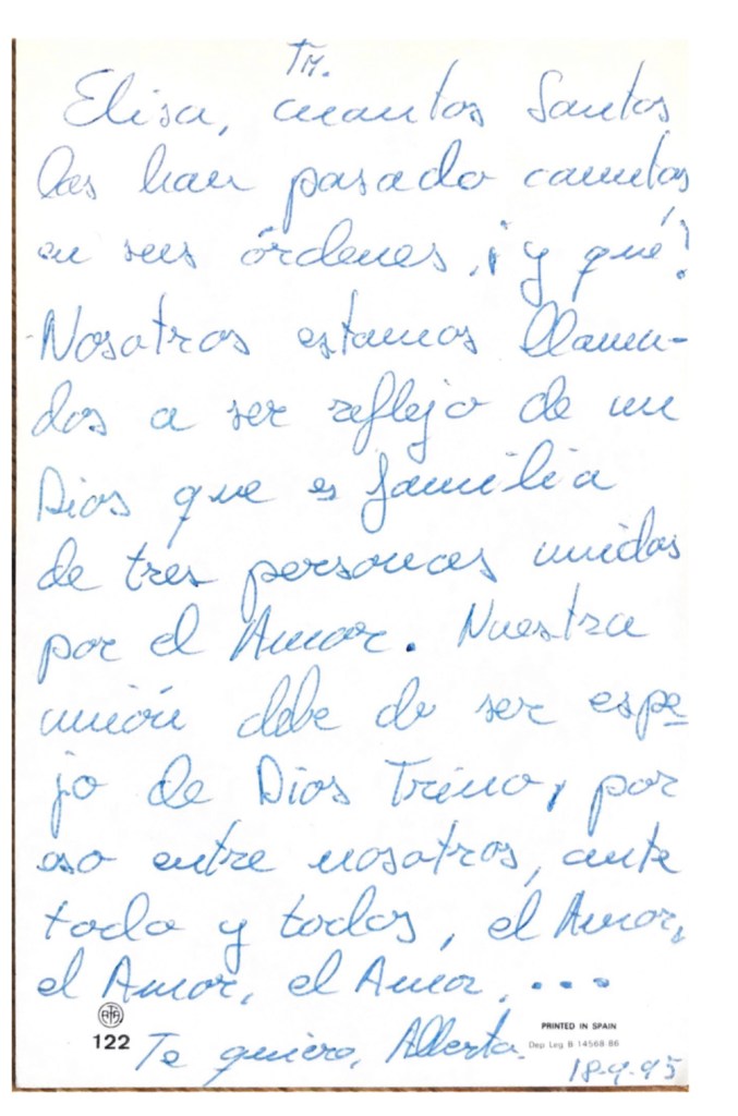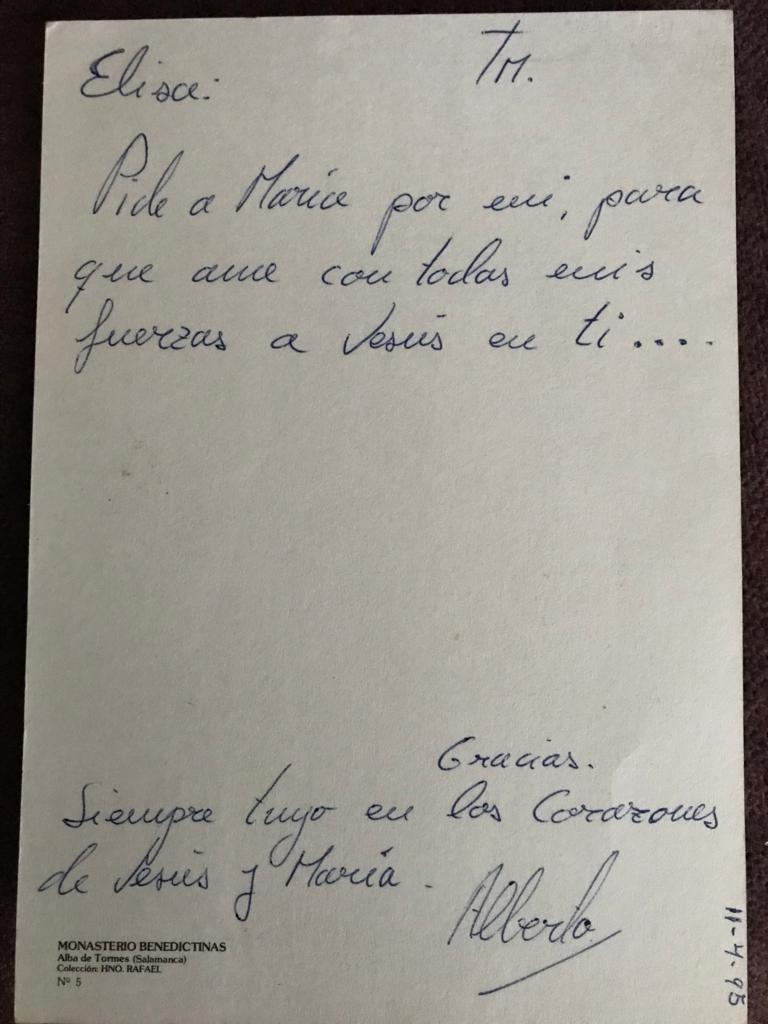 El 17 de mayo de 1997, Alberto escribió una tarjeta de ánimos para su hermana mayor Raquel. Acababa de ser madre por primera vez y su hijo tenía un problema de salud importante. Es un mensaje de amor y esperanza del Hermano Rafael, uno de los Santos favoritos de Alberto.