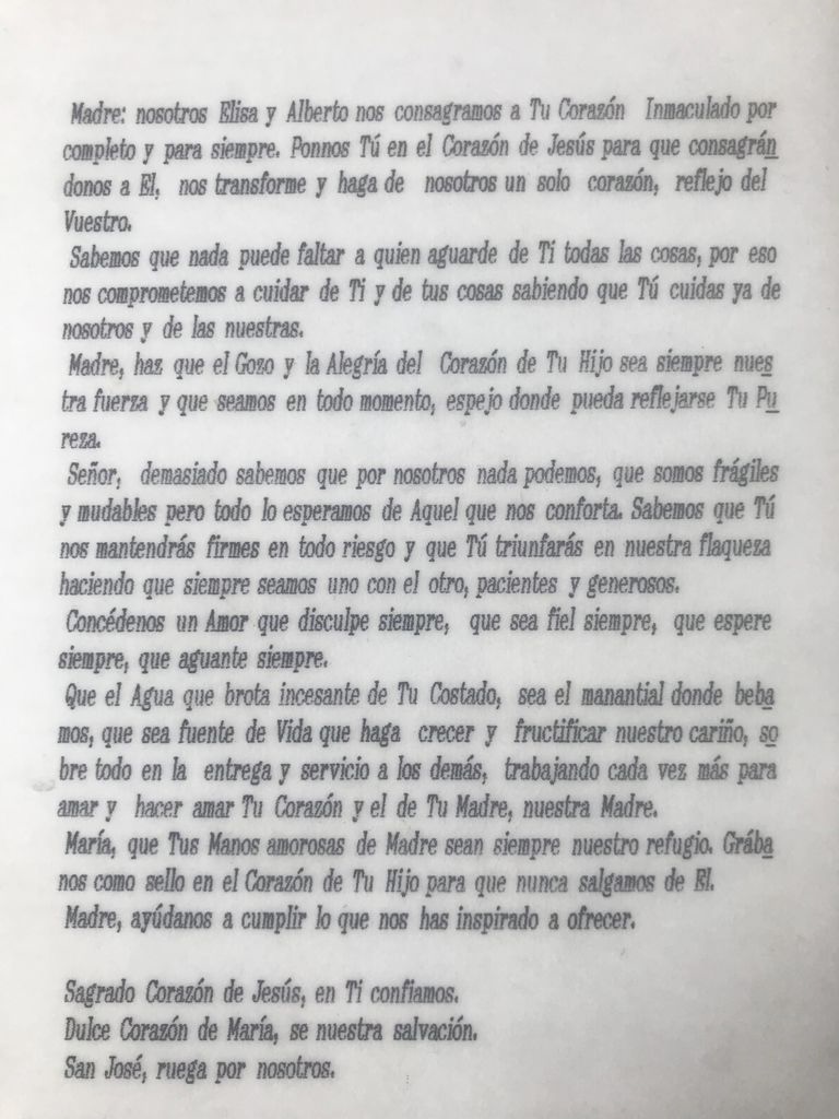 Madre nosotros Elisa y Alberto nos consagramos a tu Corazón Inmaculado por completo y para siempre. Ponnos tú en el Corazón de Jesús, para que, consagrándonos a Él, nos transforme y haga de nosotros un sólo corazón, reflejo del Vuestro.